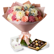 - Beyaz, mor veya pembe krizantem, gül ve okaliptüs buketi;